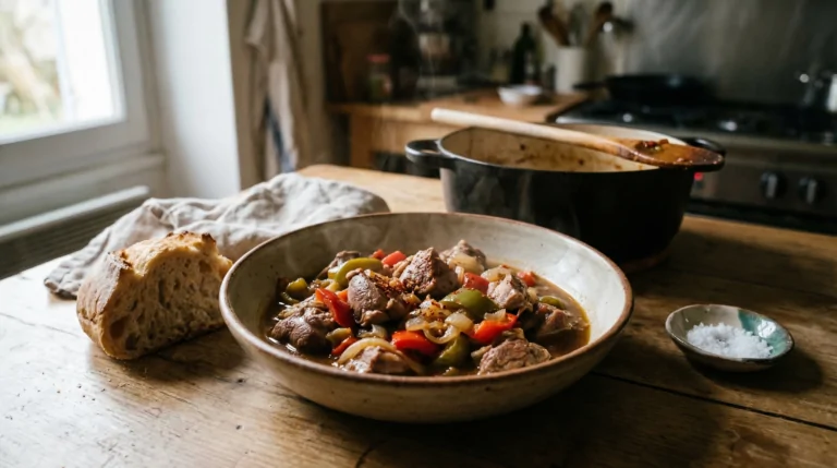Mi versión se apega a lo básico: carne picada a mano (no hecha puré), cebollas, pimientos, ajo, pimiento de Espelette, un poco de vino blanco para desglasar y luego una cocción lenta tapada para que todos los ingredientes se integren. El secreto está en el tamaño de los trozos: pequeños y uniformes, para que se cocine rápido y cada bocado tenga un poco de todo.